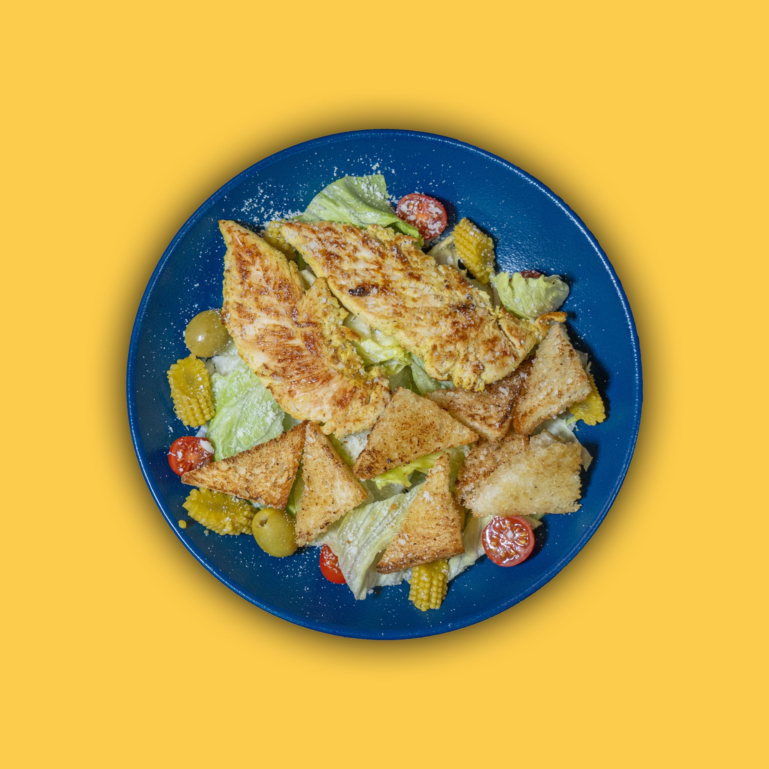 فیله سوخاری شده، نان تست ، سس سزار ، کاهو ، زیتون ، گوجه گیلاسی ، پنیر پارمسان ،