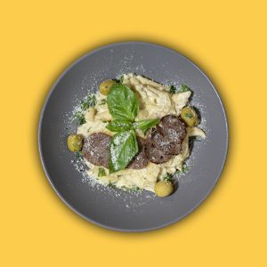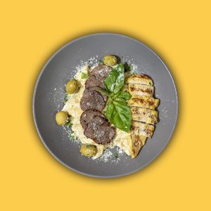 پنه ، راسته گوساله مرینت شده، پنیر پارمسان ، قارچ و گوجه گیلاسی