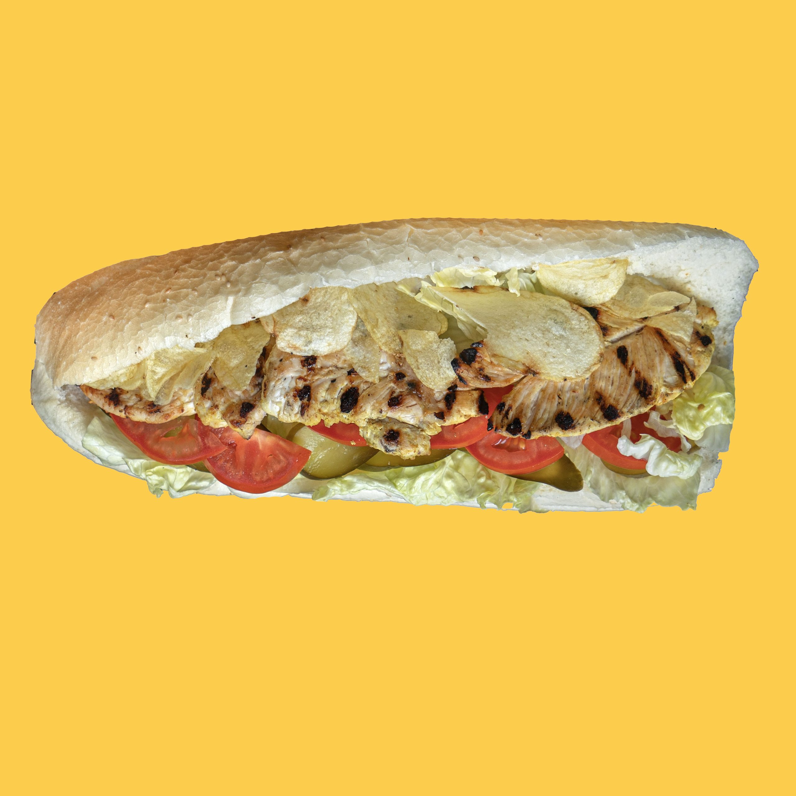 سس مخصوص ، سینه مرغ گریل شده ، گوجه ، کاهو ، خیارشور ، نان باگت
