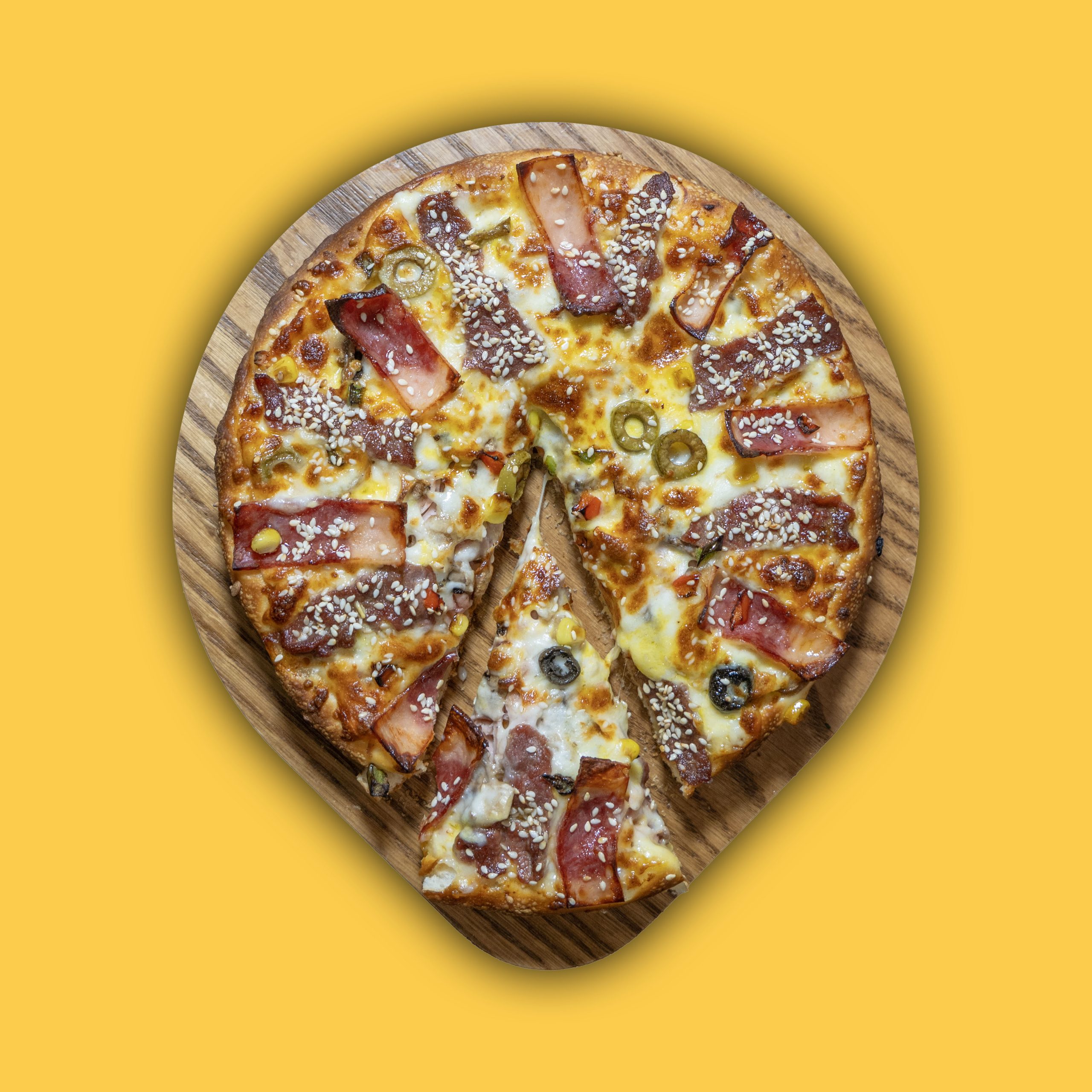 سس مخصوص ، گوشت چرخ کرده ، پپرونی ، پیاز ، زیتون ، قارچ و فلفل دلمه