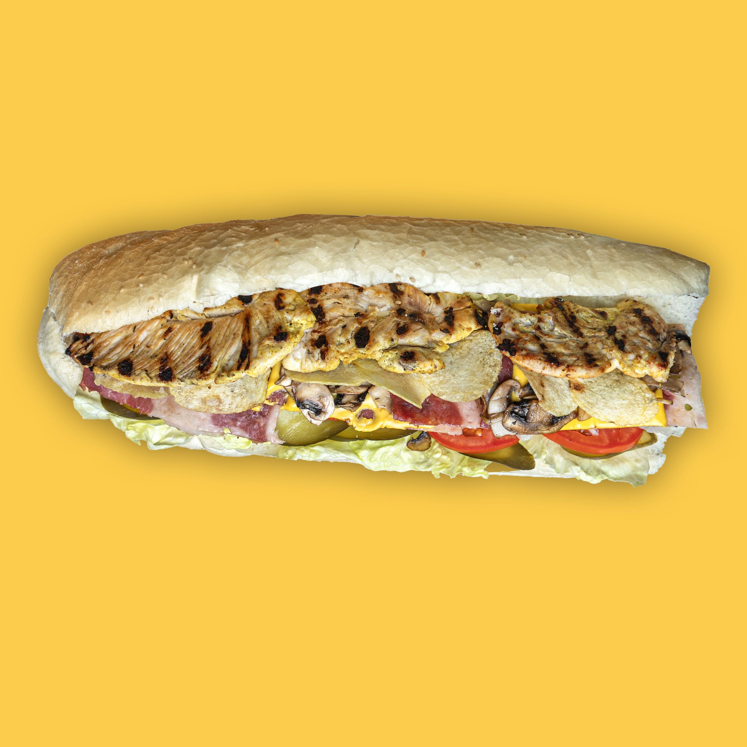 سس مخصوص ، دو عدد فیله گریل شده ، بیکن مرغ 90& ، قارچ و پنیر ، گوجه ، کاهو ، خیارشور ،